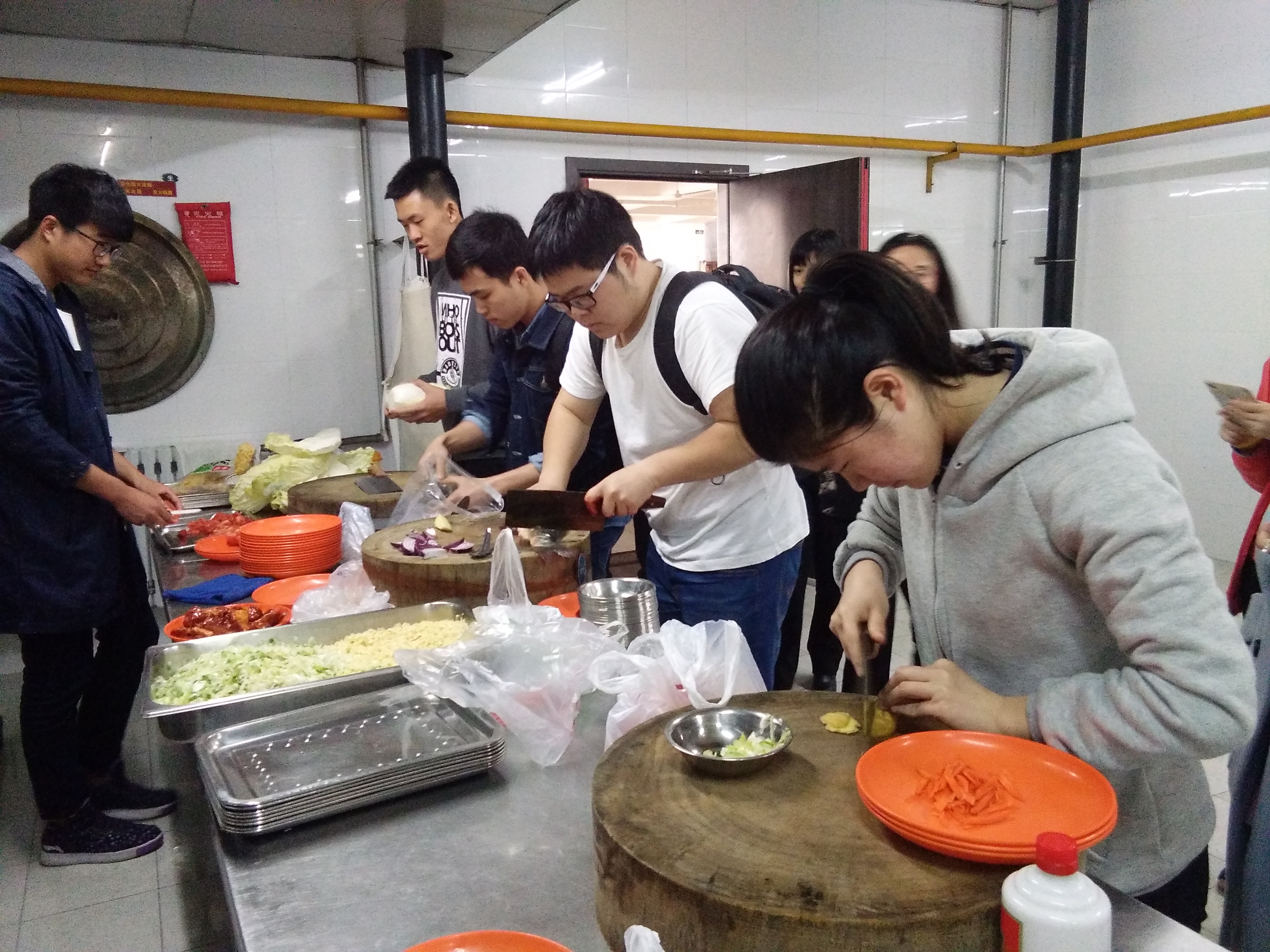 同学们陆续走进整洁干净的基础园食堂后厨,纷纷拿出早已准备好的食材,很快响起了锅碗瓢盆的碰撞声。有的同学细细切着姜丝,有的同学一下一下剁着鸡腿,最引人注目的莫过于做鱼的同学,娴熟的刮鳞技巧引得工作人员也驻足旁观。整个做菜过程繁忙却有序,多人组配合默契,单人组只手撑天,大家有条不紊的演绎着早已烂熟于心的菜谱。作为评委的食堂大厨们也不时指点着同学们的动作。很快香气开始在厨房里飘扬了,青菜的碧绿青嫩和肉菜的浓郁鲜香调动着旁观同学的味蕾,当成品端上来的那一刻,赞叹之声不绝于耳。大家情不自禁鼓起掌来。评委品尝之后一一给出了点评和评分,有的同学还热情的把自己的作品分享给工作人员和旁观同学一起品尝。最后大家一起将厨房打扫干净,初赛圆满收尾。