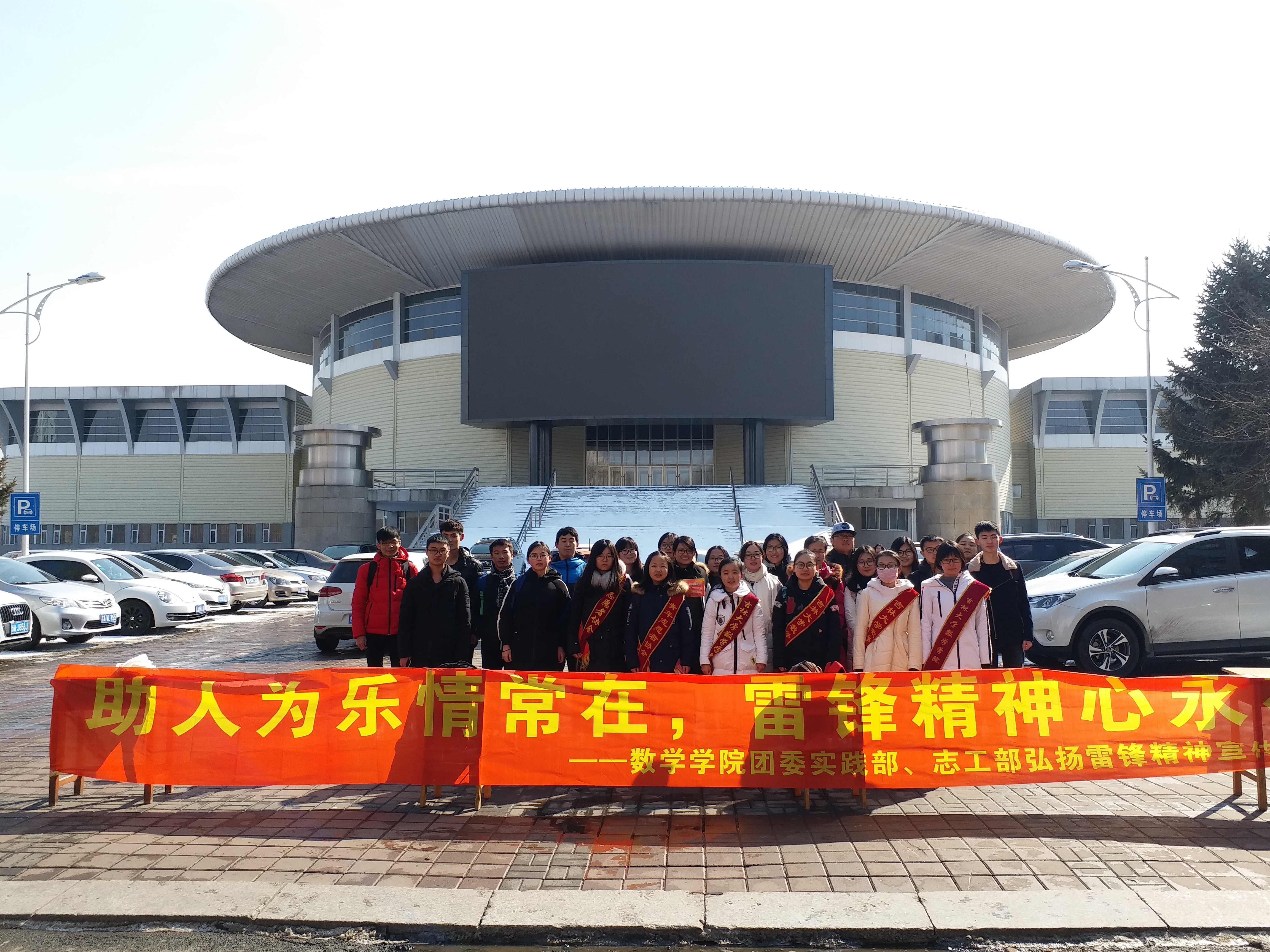 3月5日中午12:15-13:15,志工部和实践部全体成员在体育馆前积极主动地向周围的同学散发传单、为其讲解雷锋同志的故事并呼吁周围同学们向雷锋同志学习其无私奉献的精神。