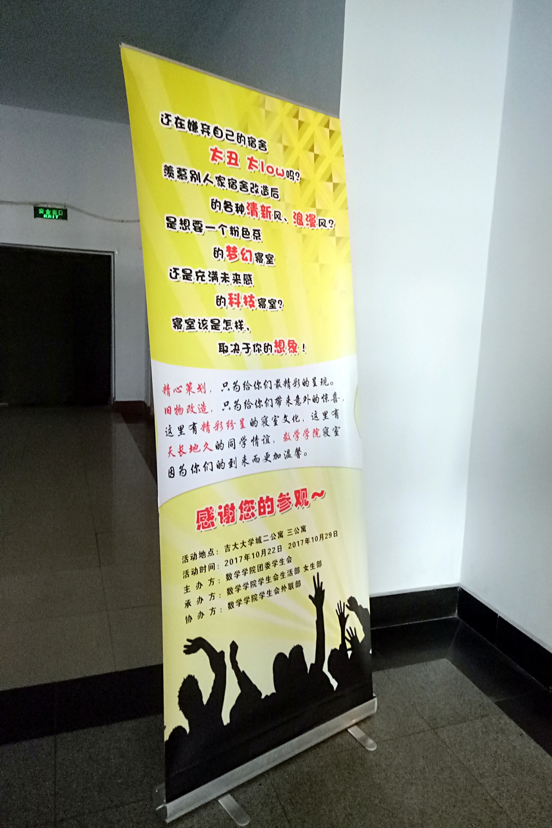 沿着走廊一路前行,两侧是精心绘画的壁纸,涵盖了整个吉大的风貌,展现了EMC易倍丰富多彩的文化生活。在经过女生部和生活部部员的介绍以后,评委和老师们开始依次参观各个寝室,大家的寝室都整洁干净,各有特色。同学们分别介绍了他们寝室的设计理念,还简单讲解了一下他们平时的寝室生活以及室友之间的趣事。最后,寝室文化节在同学们的欢声笑语中结束了。