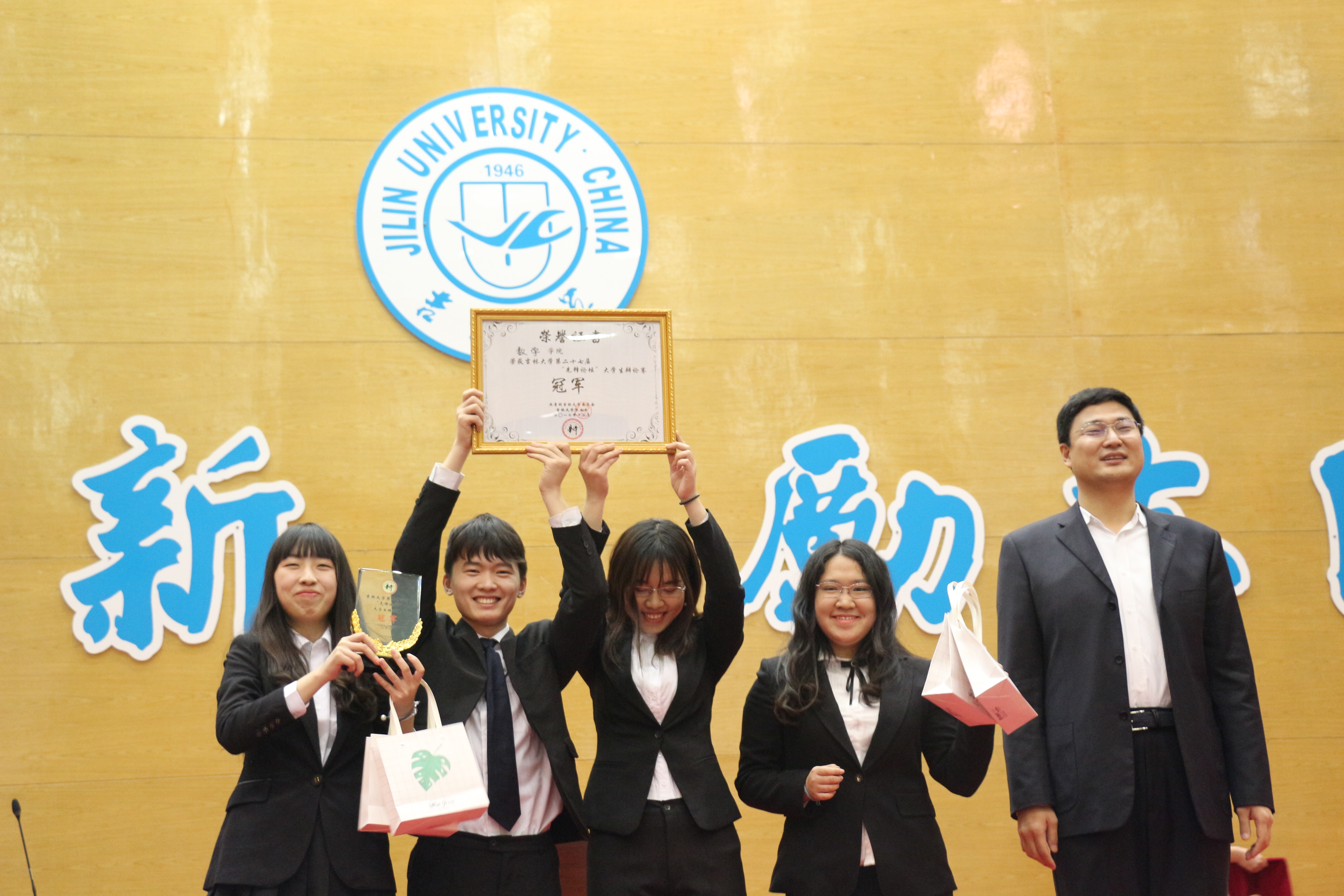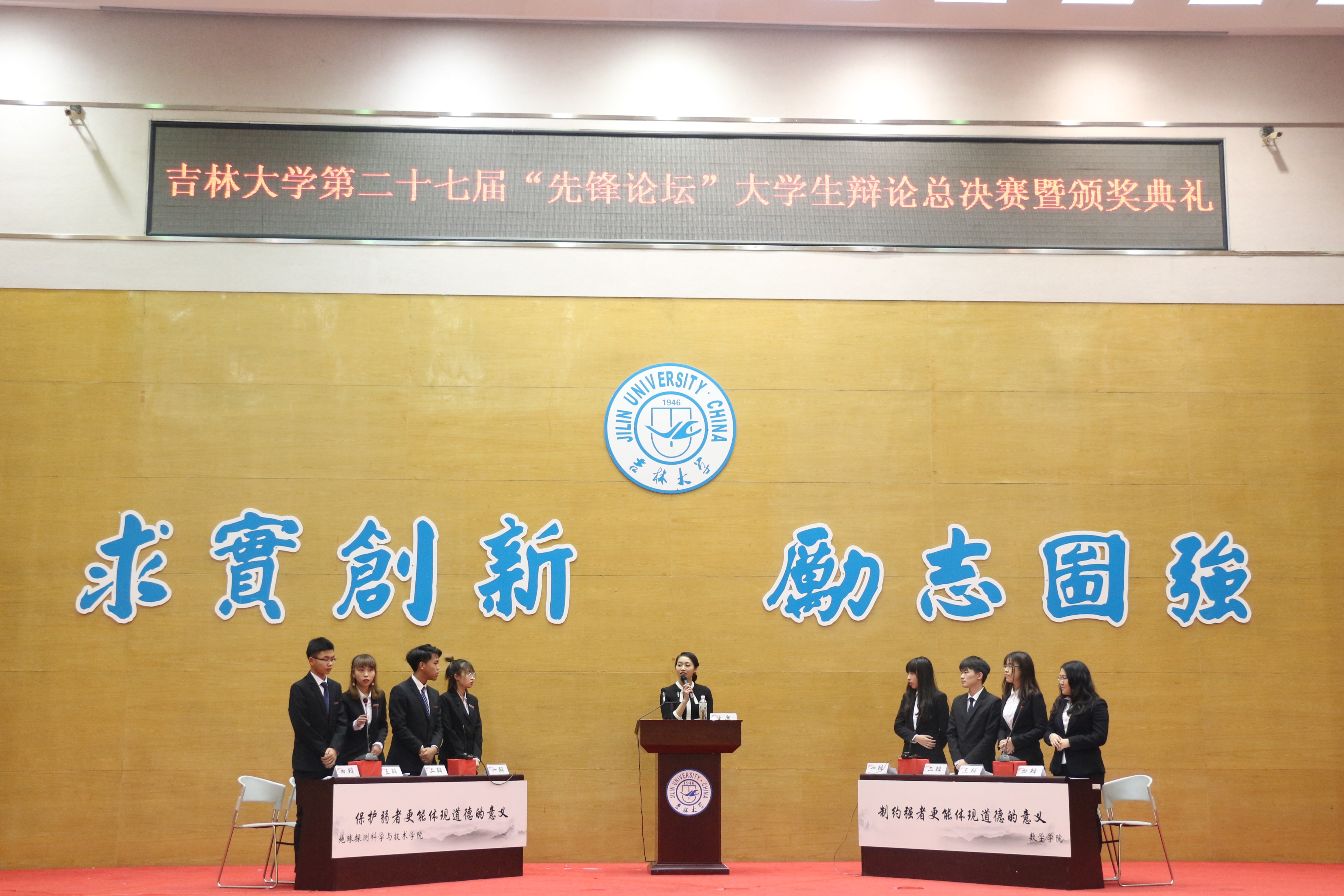是谁,舌灿莲花,堪使丝竹失色;是谁,唇如利剑,可令管弦无声。在欢呼和呐喊声中决赛拉开序幕,决赛辩题为帮助弱者与制约强者哪一个更能体现道德的意义,EMC易倍为反方制约强者更能体现道德的意义。我方一辩辛悦开篇立论提出道德的意义在于促进社会和谐发展,并从维护社会秩序,解决社会矛盾,引导正向价值三个方面掷地有声地陈述。我方二辩俞宁宁紧随其后,幽默生动地重申保护和制约的概念,拆解对方观点。应对质询,从容不迫,灵活地化解了对方的进攻。我方三辩程蕾巧妙发问,从动机过程结果三个角度准确地论述了制约强者所能体现出的道德意义。我方四辩刚铭君字字珠玑,鞭辟入里,动之以理晓之以情,一句“不要人夸颜色好,只留清气满乾坤”声震全场,引得掌声雷动。评委老师从学理的角度阐释了对辩题的理解并对场上辩手提出了表扬。在万众期待中,主席宣布结果,EMC易倍荣获冠军!共青团吉林省副书记牟大鹏为EMC易倍颁发了奖状以及奖杯。