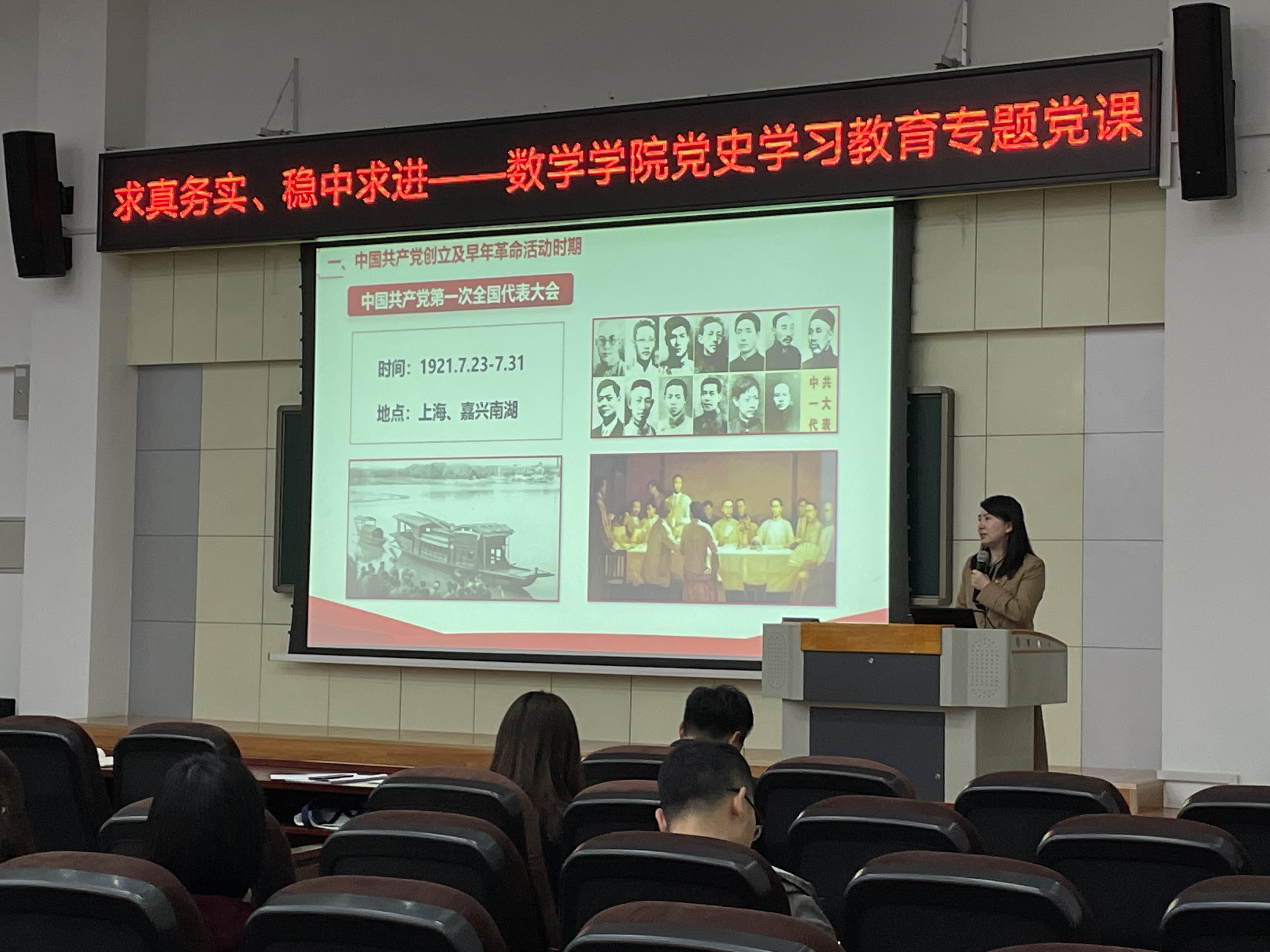 首先,张然教授以不同历史时期为节点,与全体教师一起回顾了党的百年奋斗历程、伟大成就和理论创新。从中国共产党创立及早年革命活动时期的红船精神,到土地革命时期的井冈山精神、长征精神,抗日战争时期—全国解放战争时期的延安精神,再到社会主义革命和建设时期的抗美援朝精神以及改革开放和现代化建设新阶段的抗疫精神,一个个生动鲜活的事例让我们深刻认识到中国共产党在中国由弱到强,直至今天能够屹立在世界之林,每一步举措都让世界各国无法忽视的100年里为中华民族复兴所做出的伟大贡献。