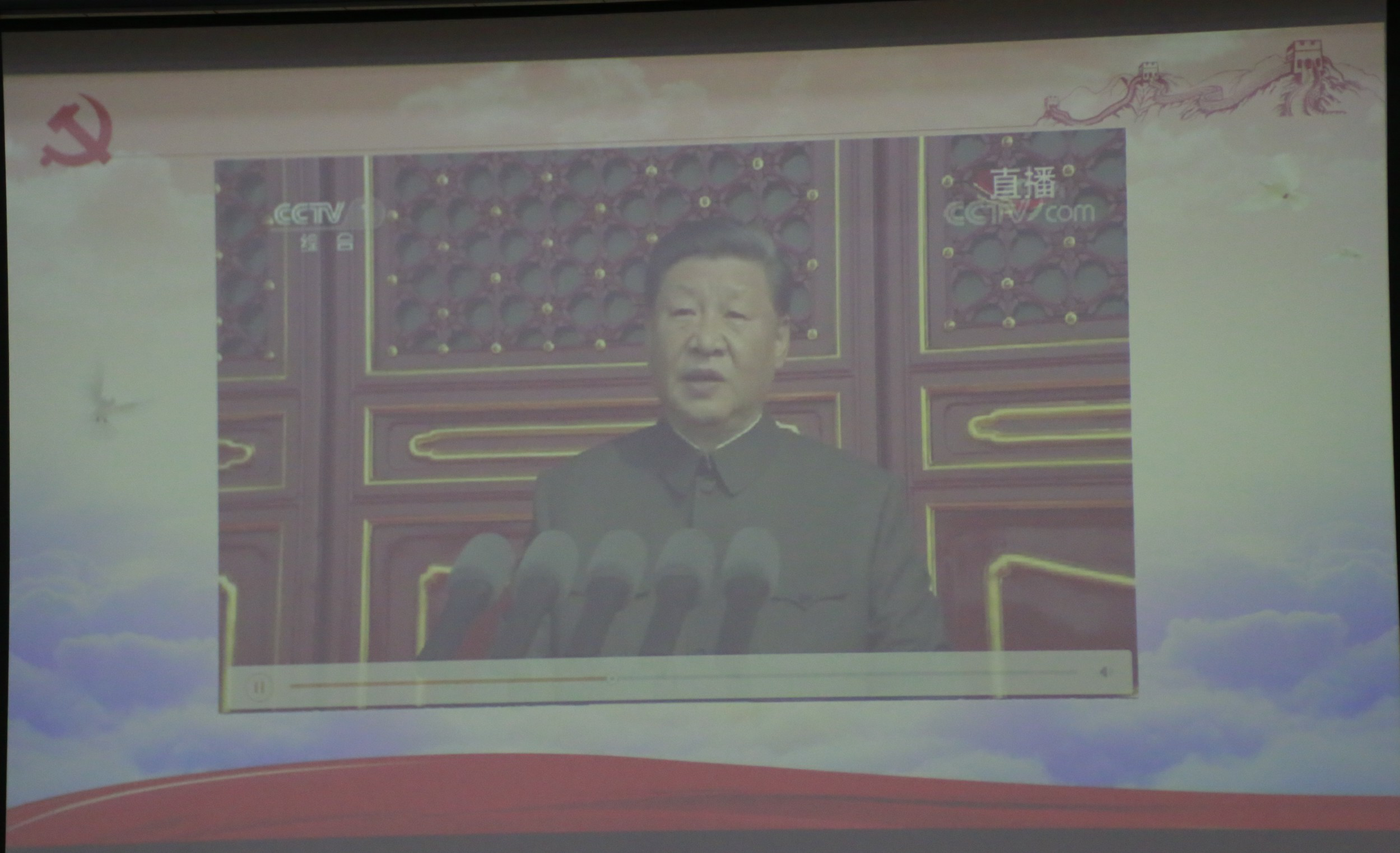 首先,老师带领全体同学观看了习近平总书记在中华人民共和国成立七十周年大会上的讲话视频,在此期间所有同学都全神贯注。习近平总书记的讲话,主要围绕七十年来祖国母亲的“心路历程”,点到了在亿万中国人民长期不懈努力下祖国所取得的各项成就,并表达了我们对于祖国更加美好的明天的展望与期待。所有人的内心都回荡着同样慷慨激昂的声音:“伟大的中华人民共和国万岁!伟大的中国共产党万岁!伟大的中国人民万岁!”