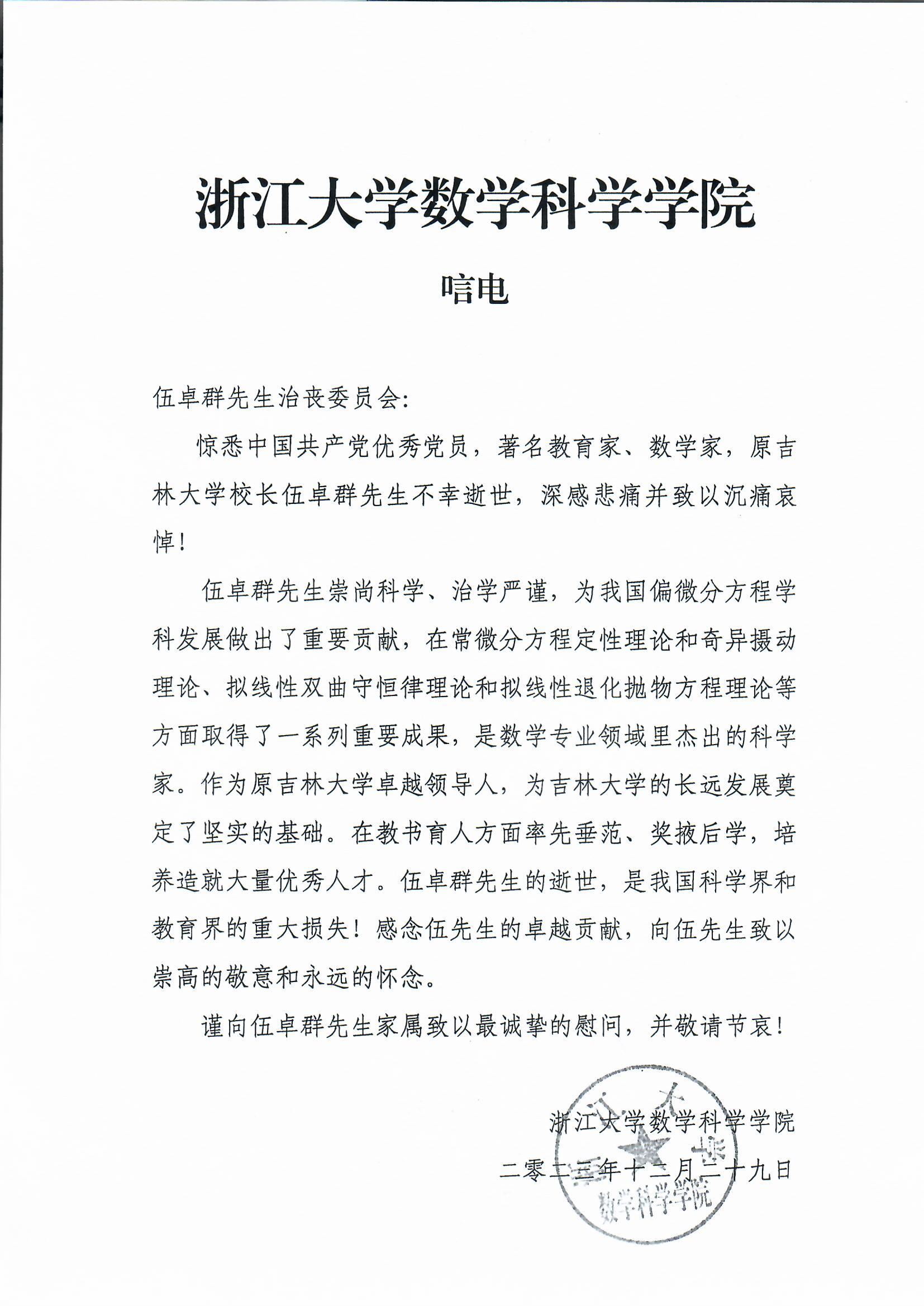 浙江大学数学科学公司唁电