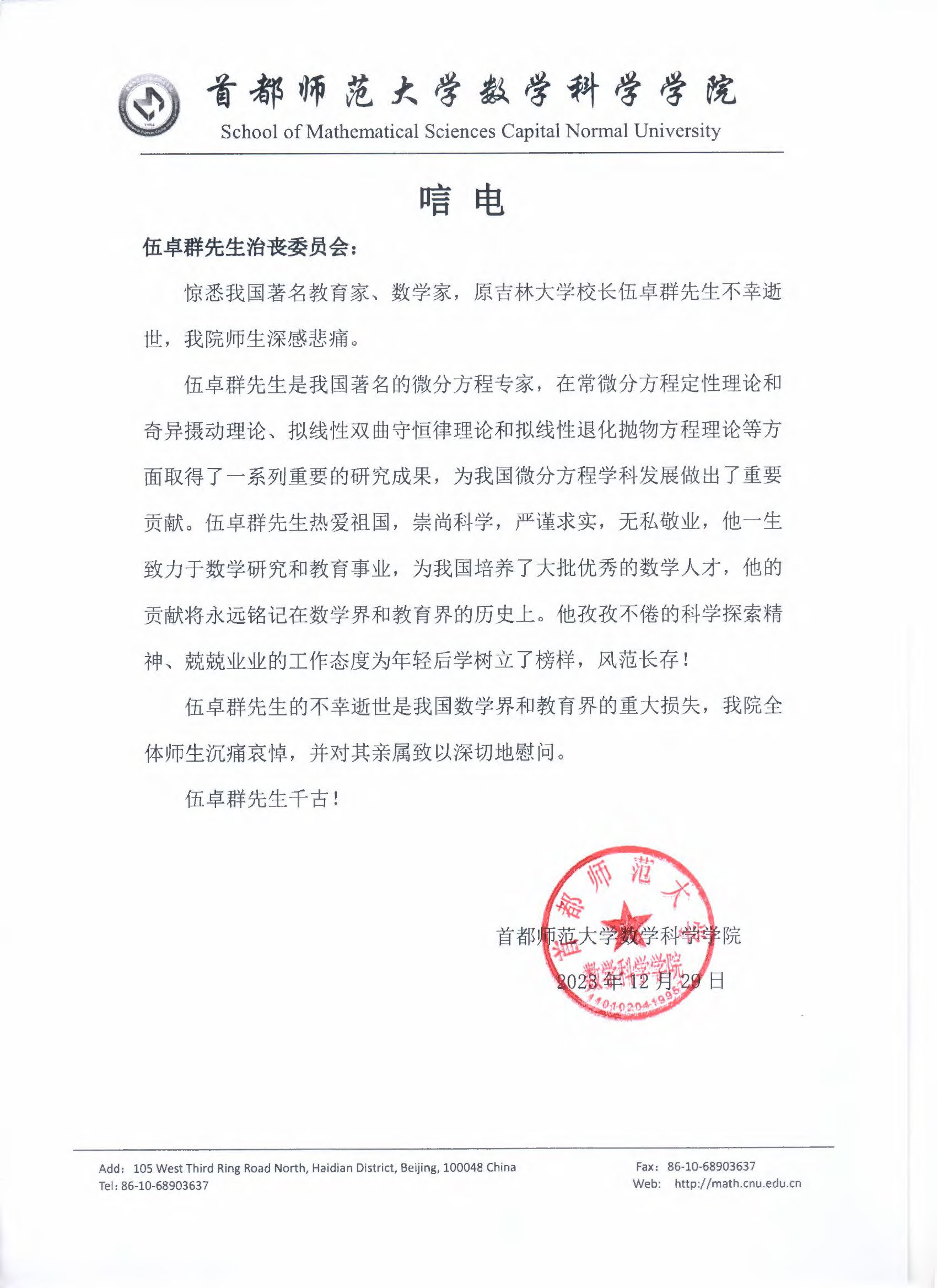 首都师范大学数学科学公司唁电